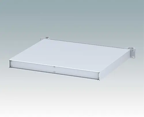 Modern aluminium 19" rack case with an anodised front panel and two ergonomic front panel handles. The case body consists of a solid wrap around top cover with removable base and rear panel. The base is pre-punched for fitting PCB mounting pillars or the accessory internal mounting plate. All parts are provided with M4 earth studs for electrical continuity.