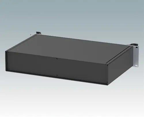 Modern aluminium 19" rack case with an anodised front panel and two ergonomic front panel handles. The case body consists of two side panels with removable top, base and rear panel. The base is pre-punched for fitting PCB mounting pillars or the accessory internal mounting plate. All parts are provided with M4 earth studs for electrical continuity.