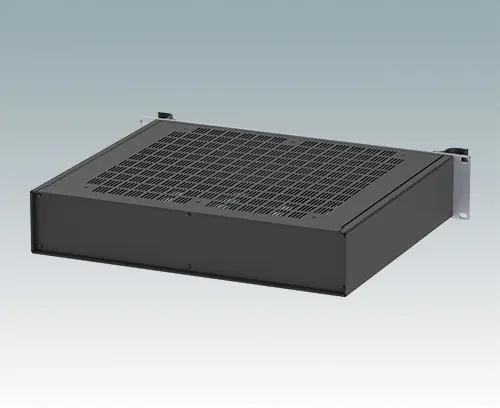 Modern ventilated aluminium 19" rack case with an anodised front panel and two ergonomic front panel handles. The case body consists of two side panels with removable top, base and rear panel. The base is pre-punched for fitting PCB mounting pillars or the accessory internal mounting plate. All parts are provided with M4 earth studs for electrical continuity.