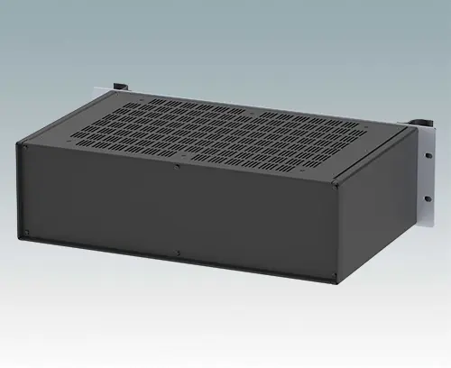 Modern ventilated aluminium 19" rack case with an anodised front panel and two ergonomic front panel handles. The case body consists of two side panels with removable top, base and rear panel. The base is pre-punched for fitting PCB mounting pillars or the accessory internal mounting plate. All parts are provided with M4 earth studs for electrical continuity.