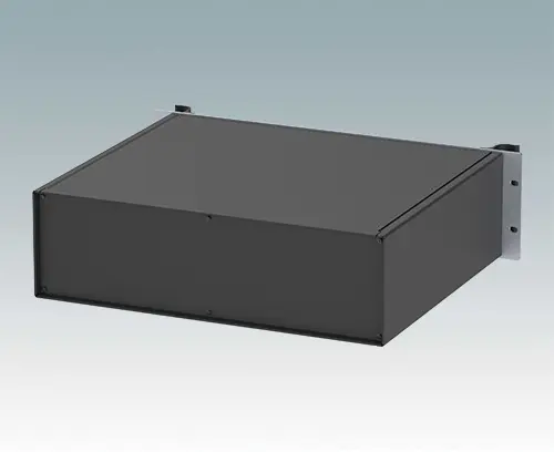 Modern aluminium 19" rack case with an anodised front panel and two ergonomic front panel handles. The case body consists of two side panels with removable top, base and rear panel. The base is pre-punched for fitting PCB mounting pillars or the accessory internal mounting plate. All parts are provided with M4 earth studs for electrical continuity.