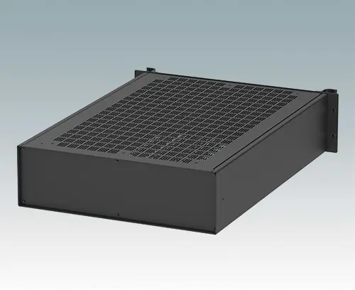 Modern ventilated aluminium 19" rack case, 24" deep, with a painted black front panel and two ergonomic front panel handles. The case body consists of two side panels with removable top, base and rear panel. The base is pre-punched for fitting PCB mounting pillars or the accessory internal mounting plate. All parts are provided with M4 earth studs for electrical continuity.