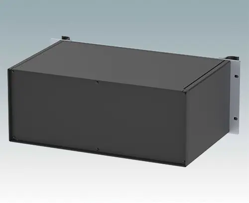 Modern aluminium 19" rack case with an anodised front panel and two ergonomic front panel handles. The case body consists of two side panels with removable top, base and rear panel. The base is pre-punched for fitting PCB mounting pillars or the accessory internal mounting plate. All parts are provided with M4 earth studs for electrical continuity.
