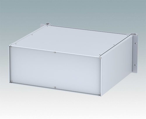 Modern aluminium 19" rack case with an anodised front panel and two ergonomic front panel handles. The case body consists of two side panels with removable top, base and rear panel. The base is pre-punched for fitting PCB mounting pillars or the accessory internal mounting plate. All parts are provided with M4 earth studs for electrical continuity.