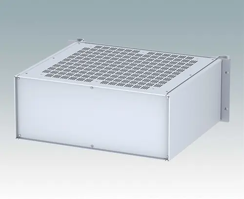 Modern ventilated aluminium 19" rack case with an anodised front panel and two ergonomic front panel handles. The case body consists of two side panels with removable top, base and rear panel. The base is pre-punched for fitting PCB mounting pillars or the accessory internal mounting plate. All parts are provided with M4 earth studs for electrical continuity.