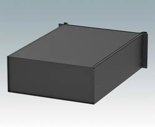 Modern aluminium 19" rack case, 24" deep, with a painted black front panel and two ergonomic front panel handles. The case body consists of two side panels with removable top, base and rear panel. The base is pre-punched for fitting PCB mounting pillars or the accessory internal mounting plate. All parts are provided with M4 earth studs for electrical continuity.