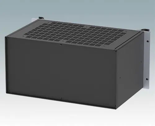 Modern aluminium 19" rack case with an anodised front panel and two ergonomic front panel handles. The case body consists of two side panels with removable top, base and rear panel. The base is pre-punched for fitting PCB mounting pillars or the accessory internal mounting plate. All parts are provided with M4 earth studs for electrical continuity.