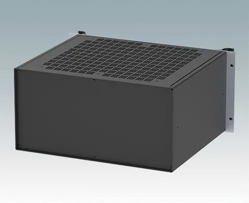 Modern aluminium 19" rack case with an anodised front panel and two ergonomic front panel handles. The case body consists of two side panels with removable top, base and rear panel. The base is pre-punched for fitting PCB mounting pillars or the accessory internal mounting plate. All parts are provided with M4 earth studs for electrical continuity.