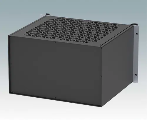 Modern ventilated aluminium 19" rack case with an anodised front panel and two ergonomic front panel handles. The case body consists of two side panels with removable top, base and rear panel. The base is pre-punched for fitting PCB mounting pillars or the accessory internal mounting plate. All parts are provided with M4 earth studs for electrical continuity.