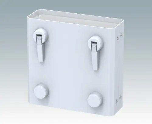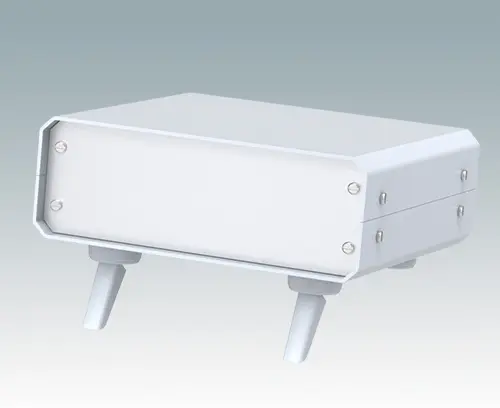 Stylish and modern case feet with tilt legs for canting. Universal design for fitting to any type of plastic or metal enclosure. Four part assembly with foot body, push-in anti-skid TPE pad, tilt leg with 120° rotation and self-tapping screw. Max. enclosure wall thickness 3 mm with screws provided (alternative screws can be supplied for larger wall thicknesses). Simply drill three holes per foot in the enclosure panel - see drawings for drilling details.