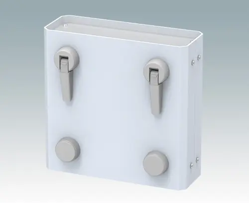 Stylish and modern case feet with tilt legs for canting. Universal design for fitting to any type of plastic or metal enclosure. Four part assembly with foot body, push-in anti-skid TPE pad, tilt leg with 120° rotation and self-tapping screw. Max. enclosure wall thickness 3 mm with screws provided (alternative screws can be supplied for larger wall thicknesses). Simply drill three holes per foot in the enclosure panel - see drawings for drilling details.