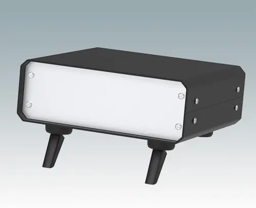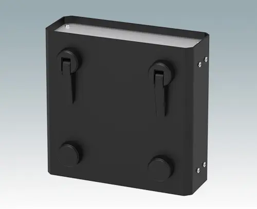 Stylish and modern case feet with tilt legs for canting. Universal design for fitting to any type of plastic or metal enclosure. Four part assembly with foot body, push-in anti-skid TPE pad, tilt leg with 120° rotation and self-tapping screw. Max. enclosure wall thickness 3 mm with screws provided (alternative screws can be supplied for larger wall thicknesses). Simply drill three holes per foot in the enclosure panel - see drawings for drilling details.