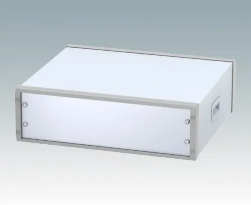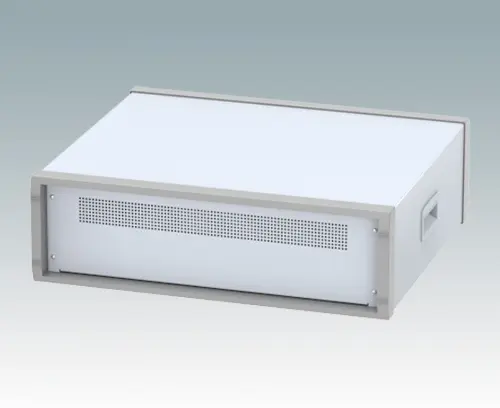 Stylish 19" instrument case for mounting 3U subracks, chassis or front panels. Desktop version with ABS sides handles. Robust design with two die cast front bezels and fabricated case body. The base panel and rear panel are ventilated. Internal chassis runners support the equipment. Supplied with pre-fitted with ABS tilt feet.