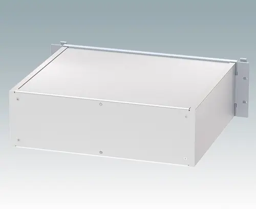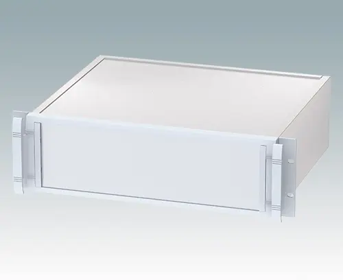Modern and robust 19" rack case with integrated 'comfort handles'. All aluminium design with attractive die cast front bezel, extruded side panels with internal PCB/chassis guide rails, rear panel and flat top and base panel. Open front panel aperture means the case does not have to be removed from the rack in order to access the electronics. Base panel is punched to accept accessory tilt feet. Order front panels separately.