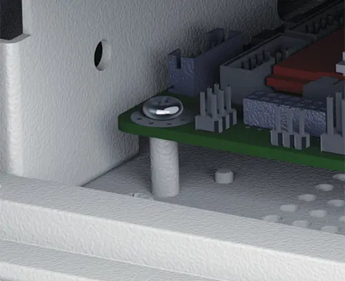 The pre-assembled internal chassis is supplied with four M3 PCB mounting pillars fitted in the base. The internal chassis can also be fitted with 7 slide-in PCBs using the accessory snap-in guide M6490010 (order 4 guides per PCB).