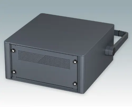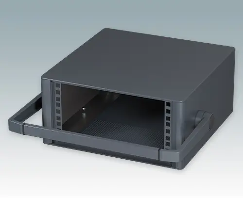Modern and highly attractive 10.5" instrument enclosure for mounting 3U subracks (42HP), chassis or front panels. Conforms to DIN 41494 & IEC 297. Stylish front and rear bezels are fitted to the aluminium case body. Clip-on trims at the front and rear hide the assembly screws giving a very professional appearance. All case panels fitted with M4 threaded pillars for earth connection. The case is supplied with a rear panel, a tilt/swivel carry handle and four ABS non-slip feet. Ventilation slots are provided in the base and rear panel. Internal chassis runners support the 10.5" equipment.