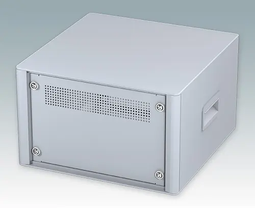 Modern and highly attractive 10.5" instrument enclosure for mounting 4U subracks (42HP), chassis or front panels. Conforms to DIN 41494 & IEC 297. Stylish front and rear bezels are fitted to the aluminium case body. Clip-on trims at the front and rear hide the assembly screws giving a very professional appearance. All case panels fitted with M4 threaded pillars for earth connection. The case is supplied with a rear panel, two ABS side handles and four ABS non-slip feet. Ventilation slots are provided in the base and rear panel. Internal chassis runners support the 10.5" equipment.
