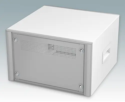 Modern and highly attractive 10.5" instrument enclosure for mounting 4U subracks (42HP), chassis or front panels. Conforms to DIN 41494 & IEC 297. Stylish front and rear bezels are fitted to the aluminium case body. Clip-on trims at the front and rear hide the assembly screws giving a very professional appearance. All case panels fitted with M4 threaded pillars for earth connection. The case is supplied with a rear panel, two ABS side handles and four ABS non-slip feet. Ventilation slots are provided in the base and rear panel. Internal chassis runners support the 10.5" equipment.