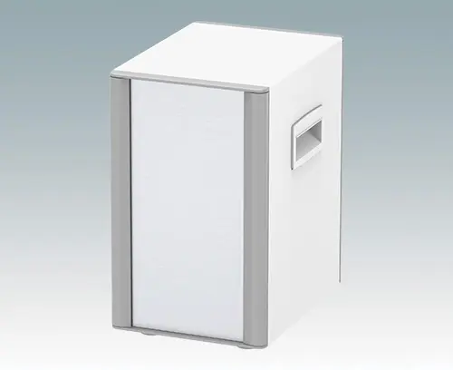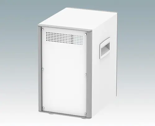 Highly attractive tower style aluminium enclosures for instrumentation. Space-saving footprint maximises tabletop or workstation space. Modern and cohesive design with no visible fixing screws. Diecast front and rear bezels fit flush in the case body. Snap-on front and rear trims hide the case and front panel screws. Ventilation holes in the base and rear panel. Internal chassis for mounting three or four shelves (accessories) for PCBs and assemblies. M4 earth points on all panels. Supplied with side handles and non-slip ABS feet. Order front panels, shelves and PCB guides separately. Order your own fully customised version.