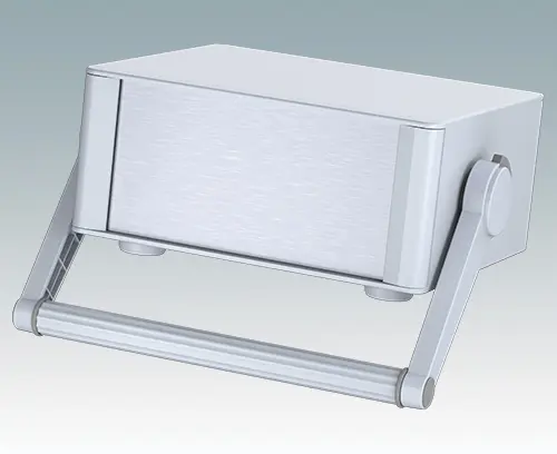 Modern and highly attractive instrument enclosure with handle/bail arm for desktop and portable electronics. Stylish front and rear bezels are fitted to the aluminium case body. Clip-on trims at the front and rear hide the assembly screws and front panel screws, giving a very professional appearance. The handle can be indexed at 30° increments. The pre-assembled internal chassis is supplied with four M3 PCB mounting pillars fitted to the base panel. The internal chassis can also be fitted with 5 slide-in PCBs using the accessory snap-in guide M6490020 (order 2 guides per PCB).