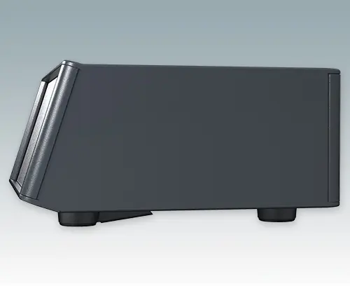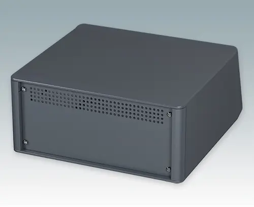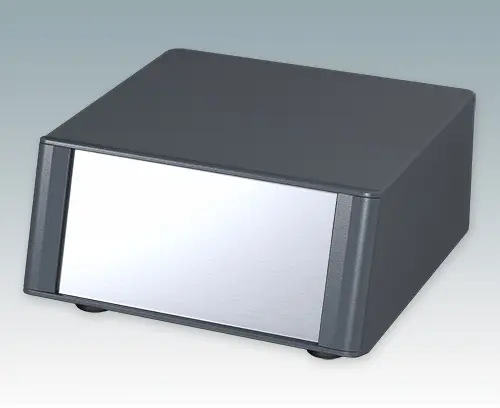 Modern and highly attractive instrument enclosure with sloping front bezel for desktop or portable electronics. Stylish front and rear bezels are fitted to the aluminium case body. Clip-on trims at the front and rear hide the assembly screws and front panel screws, giving a very professional appearance. The pre-assembled internal chassis is supplied with four M3 PCB mounting pillars fitted in the base. The internal chassis can also be fitted with 5 slide-in PCBs using the accessory snap-in guide M6490020 (order 2 guides per PCB). The case is supplied with a rear panel and four ABS feet with tilt legs. Ventilation slots are provided in the base and rear panel. Order front panels separately.