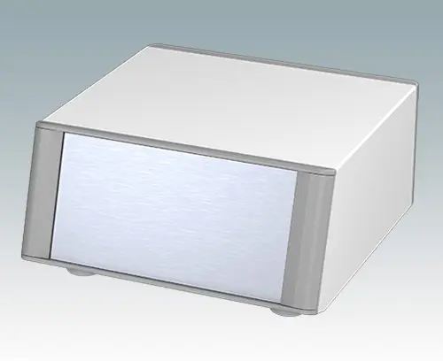 Modern and highly attractive instrument enclosure with sloping front bezel for desktop or portable electronics. Stylish front and rear bezels are fitted to the aluminium case body. Clip-on trims at the front and rear hide the assembly screws and front panel screws, giving a very professional appearance. The pre-assembled internal chassis is supplied with four M3 PCB mounting pillars fitted in the base. The internal chassis can also be fitted with 5 slide-in PCBs using the accessory snap-in guide M6490020 (order 2 guides per PCB). The case is supplied with a rear panel and four ABS feet with tilt legs. Ventilation slots are provided in the base and rear panel. Order front panels separately.