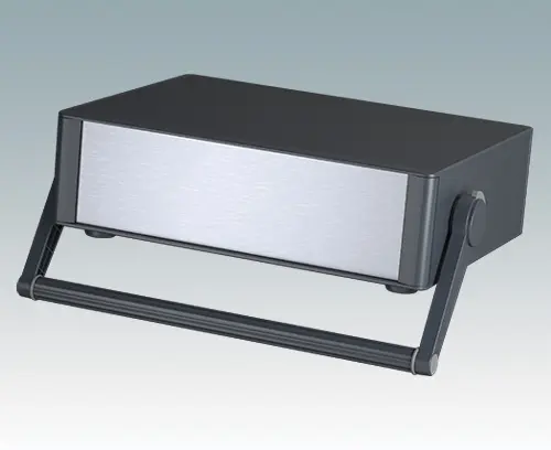 Modern and highly attractive instrument enclosure with handle/bail arm for desktop and portable electronics. Stylish front and rear bezels are fitted to the aluminium case body. Clip-on trims at the front and rear hide the assembly screws and front panel screws, giving a very professional appearance. The handle can be indexed at 30° increments. The pre-assembled internal chassis is supplied with four M3 PCB mounting pillars fitted to the base panel. The internal chassis can also be fitted with 4 slide-in PCBs using the accessory snap-in guide M6490010 (order 4 guides per PCB).