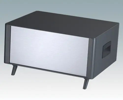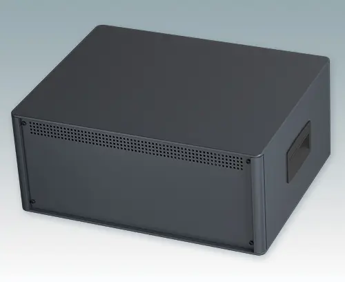 The case is supplied with a rear panel, two ABS side handles and four ABS feet with tilt legs. Ventilation slots are provided in the base and rear panel. Order front panels separately.