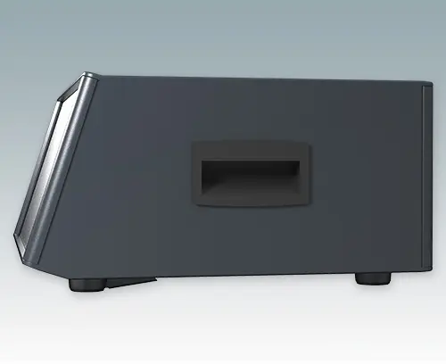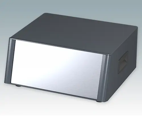 Modern and highly attractive instrument enclosure with sloping front bezel for desktop or portable electronics. Stylish front and rear bezels are fitted to the aluminium case body. Clip-on trims at the front and rear hide the assembly screws and front panel screws, giving a very professional appearance. The pre-assembled internal chassis is supplied with four M3 PCB mounting pillars fitted in the base. The internal chassis can also be fitted with 9 slide-in PCBs using the accessory snap-in guide M6490010 (order 4 guides per PCB). The case is supplied with a rear panel, two ABS side handles and four ABS feet with tilt legs. Ventilation slots are provided in the base and rear panel. Order front panels separately.
