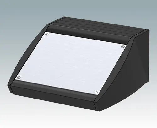 Ergonomic IP 54 rated sloping front enclosure for desktop or wall mounted electronics equipment. Pre-assembled aluminium case body with removable base panel. Front aperture for mounting the accessory front panels. Recessed rear face for mounting switches and power and data connections. To maintain IP 54 rating, fit PCB pillars M5600001, or your own plugs to the mounting holes in the base panel.