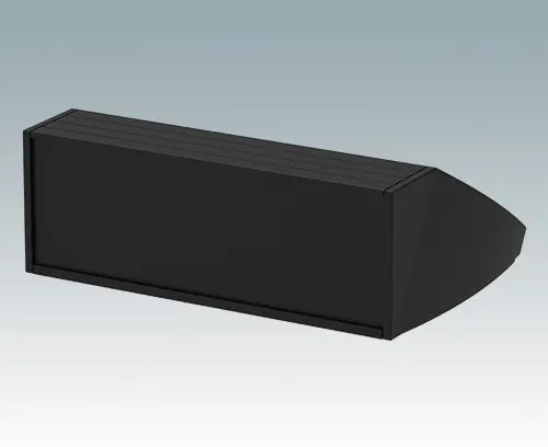 Ergonomic IP 54 rated sloping front enclosure for desktop or wall mounted electronics equipment. Pe-assembled aluminium case body with removable base panel. Front aperture for mounting the accessory front panels. Recessed rear face for mounting switches and power and data connections. To maintain IP 54 rating, fit PCB pillars M5600001, or your own plugs to the mounting holes in the base panel.