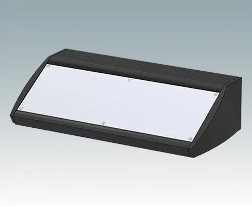 Ergonomic sloping front enclosure for desktop or wall mounted electronics equipment. Pe-assembled aluminium case body with removable base panel. Front aperture for mounting the accessory front panels.  Recessed rear face for mounting switches and power and data connections.