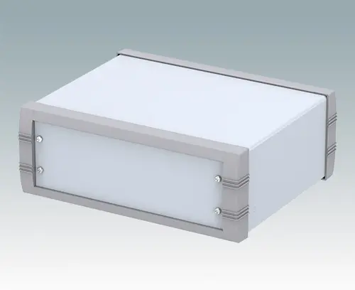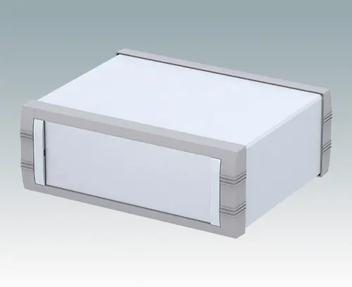 Advanced instrument enclosure for desktop electronics. Stylish front and rear bezels are fitted to the fabricated case body. Pre-assembled internal chassis supplied with four snap-in PCB guides. Four standard guide positions - additional positions can be punched on demand. The case is supplied with a rear panel and four non-slip feet. Order front panels separately.