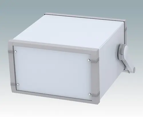 Advanced instrument enclosure with handle/bail arm for desktop and portable electronics. Stylish front and rear bezels are fitted to the fabricated case body. The handle can be indexed at 30° increments.Pre-assembled internal chassis supplied with four snap-in PCB guides. Four standard guide positions - additional positions can be punched on demand. The case is supplied with a rear panel and four non-slip feet. Order front panels separately.