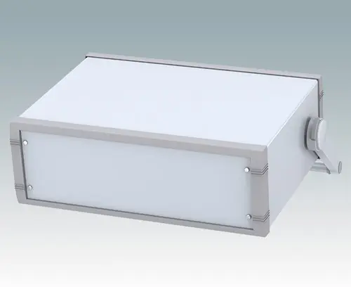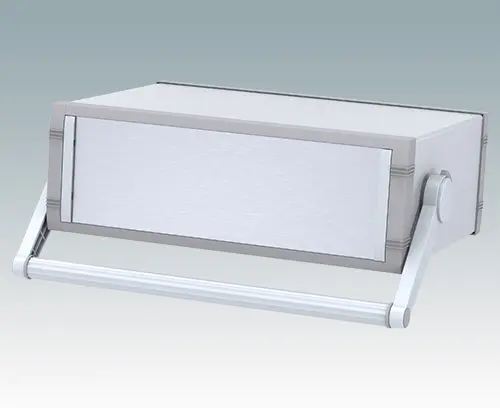 Advanced instrument enclosure with handle/bail arm for desktop and portable electronics. Stylish front and rear bezels are fitted to the fabricated case body. The handle can be indexed at 30° increments.Pre-assembled internal chassis supplied with four snap-in PCB guides. Four standard guide positions - additional positions can be punched on demand. The case is supplied with a rear panel and four non-slip feet. Order front panels separately.