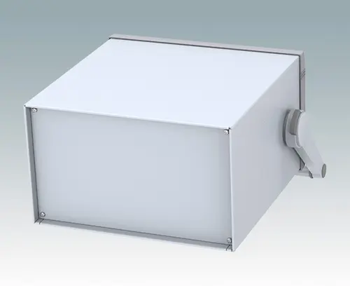 Modern instrument enclosure with handle/bail arm for desktop and portable electronics. Highly attractive die cast front bezel is fitted to the fabricated case body. The handle/bail arm can be indexed at 30° increments.The base and rear panels are removable for easy access. Mounting holes in the base are designed for fitting the accessory PCB pillars. Order the front panel separately.